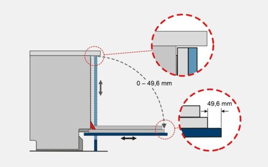 La puerta deslizante es uno de los elementos diferenciales del equipo, permitiendo instalar frentes más altos sin interferir en la apertura y trabajar con zócalos bajos de apenas 5cm, sin necesidad de recortar el panel, y, sobre todo, permite la instalación del lavavajillas en alto, en semicolumna, para facilitar su carga y descarga en el día a día, ganando en flexibilidad y ergonomía.